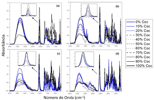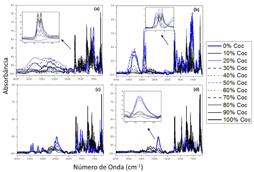 ![]() Figura 6. Espectros de ATR-FTIR para misturas binárias contendo: (a) cocaína e fermento; (b) cocaína e leite em pó; (c) cocaína e lidocaína; (d) cocaína e prometazina