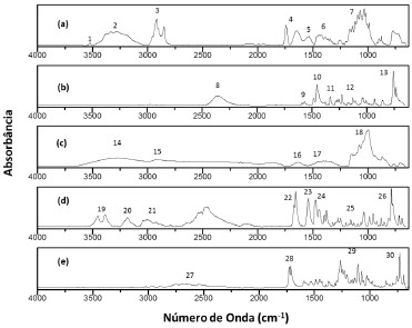 ![]() Figura 5. Espectros de ATR-FTIR das substâncias puras: (a) leite em pó; (b) prometazina; (c) fermento; (d) lidocaína; (e) cocaína