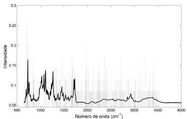 ![]() Figura 7. Espectro médio das 39 amostras analisadas por ATR-FTIR. Note que as barras verticais no espectro representam as variáveis selecionadas pelo algoritmo genético para modelagem por PLS, onde sua intensidade aumenta em funçao do número de vezes de escolha da variável