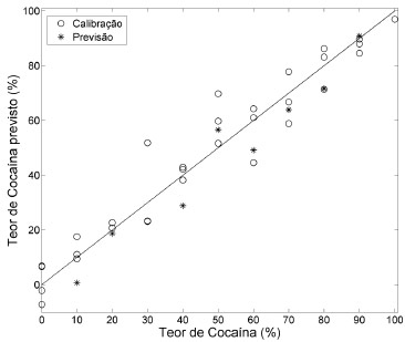 O AG reduziu de 3351 variáveis (número de onda espectrais) para 498. O modelo PLS final foi construído com 6 variáveis latentes que explicam 99,5% da variância espectral (X) e 96,9% da variância do teor de cocaína nas amostras (y), com RMSECV e RMSEP de 7,8% e coeficientes de determinação para validação cruzada e previsão de 0,936 e 0,955, respectivamente. A boa relação dos valores de referência versus os valores previstos usando modelo PLS é mostrado na Figura 8 empregando as amostras de calibração e previsão.