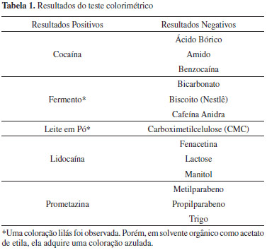 RESULTADOS E DISCUSSÃO Análise por via úmida - Teste de Scott O teste de Scott foi aplicado a uma amostra de cocaína e 17 aditivos que poderiam ser encontrados em apreensões como adulterantes e diluentes da cocaína. A Tabela 1 sumariza os resultados dos ensaios colorimétricos para todas as 18 substâncias avaliadas. Note que resultados positivos foram encontrados para as amostras de cocaína, lidocaína, prometazina, leite em pó e fermento. Os resultados do teste de Scott são ilustrados pela Figura 1a-j, onde imagens de tubo de ensaios contendo o agente complexante [Co(SCN)2] na presença de fenacetina (1a), cafeína (1b), amido (1c), ácido bórico (1d), manitol (1e), cocaína (1f), prometazina (1g), lidocaína (1h), fermento (1i) e leite em pó (1j) são destacados. A cor vermelha indica um resultado negativo (1a-e) para o teste de Scott, enquanto que a variação da coloração para o azul indica um resultado positivo (1f-h). Um resultado duvidoso foi observado para as amostras de fermento e leite em pó (1i,j), com o aparecimento de uma coloração lilás. Entretanto, essa coloração pode ser transformada para azul, na presença de acetato de etila, levando a resultados falso-positivos. Além disso, a diluição das amostras de cocaína com esses aditivos poderiam levar a resultados inconclusivos.