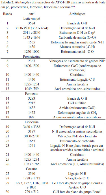 ATR-FTIR para amostras puras e misturas binárias de cocaína, prometazina, lidocaína, leite em pó e fermento A Figura 5a-e mostra os espectros de ATR-FTIR para as amostras de (a) leite em pó, (b) prometazina, (c) fermento, (d) lidocaína e (e) cocaína. Todos os espectros foram adquiridos para amostras na forma sólida (em pó). As bandas foram atribuídas a fim de se caracterizar as substâncias. Trinta e duas principais bandas foram identificadas na Figura 5a-e e as atribuições são mostradas na Tabela 2. Algumas bandas podem ser destacadas. Para a amostra de leite em pó, Figura 5a, as regiões de 3600 a 2800 cm-1 se destacam pela presença das bandas de OH (1), deformação axial de N-H (2) e estiramento C-H (3). Similar ao leite em pó, a lidocaína, Figura 5c, apresenta bandas nas regiões de 3500 a 2000 cm-1, correspondendo à deformação axial N-H (19), deformações de aminas secundárias (20) e vibrações N-H (21) do cloridrato. Já a prometazina, Figura 5b, apresenta uma banda na região de 2363 cm-1 correspondendo a vibrações de estiramento de grupos NH+ (8), enquanto que a cocaína apresenta duas bandas na região de 1700 cm-1 (28), correspondendo a vibrações C=O, Figura 5e.
