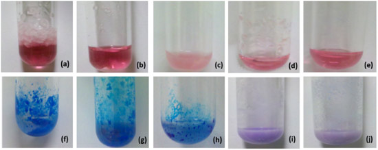 Figura 1. Imagens contendo o agente complexante [Co(SCN)2]2- na presença de (a) fenacetina, (b) cafeína, (c) amido, (d) ácido bórico, (e) manitol, (f) cocaína, (g) prometazina, (h) lidocaína, (i) fermento e (j) leite em pó. A cor vermelha indica um resultado negativo (a-e) para o teste de Scott enquanto que a cor azul indica um resultado positivo (f-j). A cor lilás indica um resultado duvidoso (i-j) sendo transformada para azul, na presença de acetato de etila