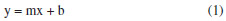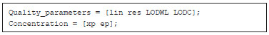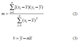 where y is the analytical signal, x is the concentration, and b and m are the intercept and slope of the regression line, respectively. This relation is obtained using the statistical model of a linear regression (least squares). The regression standard deviation and the standard deviation of the slope and intercept can be also determined. The slope and intercept values are calculated according to