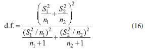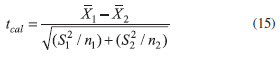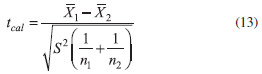 where tcal has (n1 + n2 - 2) degrees of freedom. Finally, the obtained tcal is compared with ttab (α, (n1 + n2 - 2)). If tcal < ttab, the null hypothesis is accepted because there are no significant differences between the two sets of results. However, if Fcal > Ftab, it is not possible to calculate the common variance S2. In this case, the test used for comparison between the two sets of results is the t-test of Cochran in which tcal is