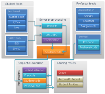 The student's code is executed in the server along with code designed by the instructor to evaluate the student's work. This framework is denoted as black-box evaluation. The evaluation code is generated by the instructor, which must satisfy some design constraints, in particular, the order in which the student and instructor code segments are executed/compiled and the way in which the grade and possible comments are to be generated so that the server can retrieve them and save them in the database. These design constraints leave freedom to the instructor to design complex exercises and their corresponding evaluation codes using all the possibilities that the chosen programming language provides, for example C code libraries or Matlab toolboxes. As an example of Goodle GMS architecture, consider a simple mathematical problem in which the students must evaluate the solution to the equation ax + b = 0, where the parameters a and b are personalized for each student depending on the first and second digits of their identification (ID) number, respectively. The student responds, for example, in accordance with the following single text line.