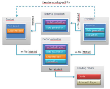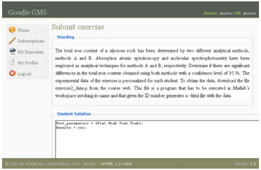 EXPERIMENTAL PART Materials and methods Goodle GMS In this paper, we present an automatic web-based exercise evaluation and data generation methodology to propose and correct numerical analytical chemistry exercises. The main idea is that the instructor, following the code fusion approach of Goodle GMS,21,22 designs the exercise wording, evaluation code, and data generation code that will allow for the automation of the process. Developing the Matlab code to automatically evaluate a student's results for a particular problem requires an initial effort; however, one of the advantages of the proposed approach is the possibility of using the same evaluation code in different courses. Goodle GMS is a web application that is executed on a dedicated server located at the Engineering College of the University of Seville. Both students and instructors access the server using a standard web browser. While the use of MCQs is probably the most widespread automatic evaluation technology, Goodle GMS is a completely different evaluation method, which is inspired by the core architecture illustrated in Figure 1. The key idea is that students submit the solutions to practical exercises by following a certain programming language syntax, including Matlab among other possibilities.