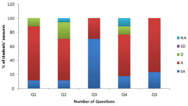 ![]() Figure 4. Student satisfaction evaluated through the post-task survey, where the results are expressed as % of student answers according to the following scale: SA: strongly agree; A: agree; D: disagree; SD: strongly disagree; NA: not answered