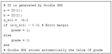 The instructor must then develop a Matlab code that is able to determine the parameters a and b from the ID number (which is provided automatically by Goodle GMS), solve the problem, and assess student responses in a workspace variable named grade. Assuming that a variable ID generated from a student's ID number is an integer vector, the instructor code would be expressed in the following format.
