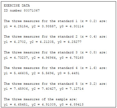 RESULTS AND DISCUSSION Exercise 1 The first part of the work consists of generating the working data using an automatic system in the Matlab environment. The concentrations and data signals of the employed standards, as well as the analytical samples are personalized for each student based in their ID number. The measurements for each student are obtained from a linear regression using a random slope and bias, and adding a 5% measurement error to both the standard and the problem measurements. The standard concentrations were fixed from 0.2 to 3.2. The problem concentration was chosen randomly between 0.5 and 3. This process is carried out using the Matlab script, exercise1_data.p, which can be downloaded by the students from the web page of the subject (Moodle). The code of this script can be obtained as described in the Supporting Information. This script must be run and provides an -html file with the necessary data that works as a function of the ID number of the student. As an example, for an ID number 80071067, the script creates a file 80071067.html containing the following data.