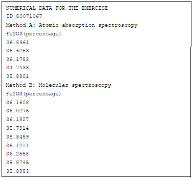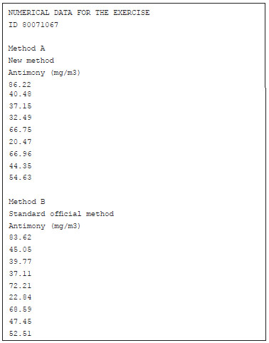If the results and the parameters are correct the grade is 10, else the grade is 0. Exercise 3 The aim of this exercise is to validate a newly established analytical method by comparing the results provided by the new method (Method A) with those obtained by a reference method (Method B). To solve this exercise, students must apply the equations described above, keeping in mind that, in this case, they are to compare two methods by means of the study of samples containing different amounts of the analyte. As in the previous exercise, each student works with individualized data according to their ID number following the same procedure as mentioned above. In this case, the data conforms to only two possible cases depending on whether or not there are significant differences. The parameter design was also verified by extensive simulation, as was the case for Exercise 2. Using the same ID example, the student will obtain, after running the generator Matlab script, exercise3_data.p, an -html file containing numerical information. As an example, for an ID number 80071067, the script creates a file 80071067.html comprising the following data.