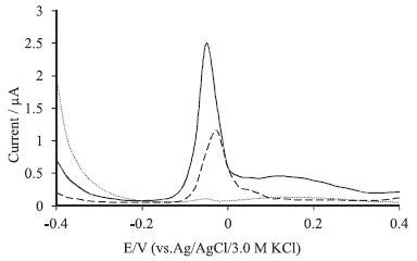 ![]() Figure 1. Anodic stripping differential pulse voltammetry curves of 0.25 μM emodin in B-R buffer solution at the pH 3.0 using bare CPE (- -) and Sil-gel/CPE (- -) after deposition at -0.2 V for 90 s. Bare CPE (....) in B-R buffer solution served as control. Potential range -0.4 to +0.4 V, potential step 0.025 V, potential pulse 0.025 V, pulse time 0.05 s, scan rate 50 mv/s