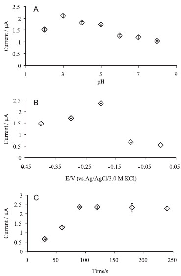 ![]() Figure 2. The oxidation peak currents of 0.25 µM emodin as a function of A) pH; B) deposition potential and C) deposition time. Error bar represents the standard deviation of five measurements