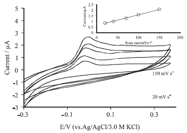 Putting these findings together, we may imply that the specific interactions (presumably hydrogen bonds) among silanol groups and hydroxyl groups of emodin gives raise under acidic condition. With increasing pH, deprotonization of both silanol and hydroxyl groups occurred leading to repulsion of negatively charged emodin from negatively charged silica gel surface.21 A possible mechanism for the reaction of silica gel with emodin at the modified CPE is attributed to the following steps: (1) pre-concentration step (buffer solution at pH 3.0, deposition potential -0.2 V, deposition time 90 s). ≡Si - OH(CPE) + HO - Emodin(solution) ↔ ≡Si - OH...H - O - Emodin(CPE) (2) stripping step (buffer solution at pH 3.0, positive scan from -0.3 to +0.1 V) ≡Si - OH...H - O - EmodinCPE) ↔ ≡Si - OH + Emodin(ox) + ne- Effect of scan rate Cyclic voltammograms of Si-gel/CPE in B-R buffer solution at pH 3.0 at various scan rates are shown in Figure 4. As indicated, the oxidation peak potentials slightly shifted to the more positive potentials with increasing of the scan rate between 20 and 150 mV/s. The oxidation currents is linearly proportional to the scan rate (Figure 4, inset) (Ia = 0.0096 V/s + 0.6366; R2 = 0.9981). These findings indicate that the electrochemical process of emodin at Si-gel/CPE was surface controlled.