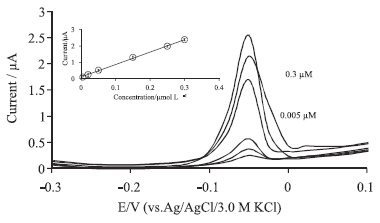 ![]() Figure 5. Anodic stripping differential pulse voltammetry curves of various concentration of emodin on Si-gel/CPE in Britton-Robinson buffer at the pH 3.0 after deposition (-0.2 V, 90 s). Potential range from -0.3 to +0.1 V, potential step 0.025 V, potential pulse 0.025 V, pulse time 0.05 s, scan rate 50 mV/s. Inlet: The plot of oxidation current vs. concentration of emodin