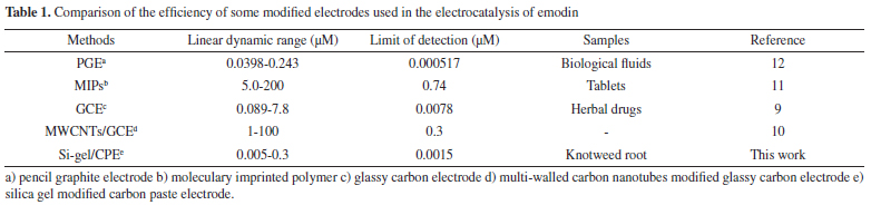 CONCLUSIONS The electrochemical determination of emodin on the surface of Si-gel/CPE by ASDPV was firstly investigated in this study. The electrode is proved to be of high sensitivity, excellent selectivity, reproducibility and stability. It was shown that Si-gel/CPE remarkably enhanced the oxidation peak current of emodin comparing with that using unmodified CPE. The proposed method was successfully applied to the real sample.