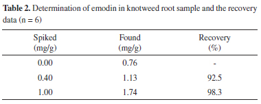 After 45 days of storage in room temperature, the oxidation current of emodin at the concentration of 10×10-9 mol L-1 was not significantly different in comparison with that using freshly prepared electrode (p > 0.05). The accuracy of the method was investigated by the repeated measurements of 10 ×10-9 mol L-1 and 100 ×10-9 mol L-1 emodin (n = 15) and the relative standard deviation (RSD) was found to be 4.7% and 5.4%, respectively. Interferences studies Si-gel/CPE showed a remarkable selectivity towards emodin oxidation by ASDPV in the study. In the presence of emodin, the results show that the tolerable concentration ratios with respect to 0.1×10-6 mol L-1 emodin were 30 folds of ascorbic acid, 80 folds of tartaric acid, 70 folds of rutin, 60 folds of oxalic acid, 50 folds of citric acid, 100 folds of glucose, dextrin and starch. The presence of interfering species influenced the oxidation current of emodin by less than 5% in all cases. Sample determination The proposed method was applied to emodin determination in knotweed root with results shown in Table 2. It can be seen the current method was sensitive for emodin determination with a good recovery in the range of 92.5-98.3%.