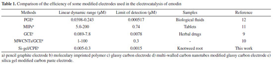 The linearity ranges and calculated LOD obtained from the Si-gel/CPE were compared with other methods. The LOD of proposed method was lower in comparison with almost all the studies mentioned in the Table 1.9-11 Moreover, there is also possibility to apply this Si-gel/CPE for the flow injection analysis system. The better LOD for emodin determination has been reported using pencil graphite electrode but the linear response of oxidation current of emodin to its concentration was limited.12 The Si-gel/CPE electrode was proved to be extremely sensitive, simple renewable and easy in preparation and storage.