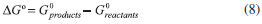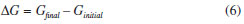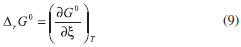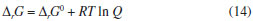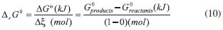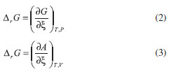 Before presenting those examples, it may be useful to review briefly the meaning of ΔrG, which also serves to stablish the different meanings of the three remaining quantities examined in this study, ΔG, ΔrGº and ΔGº. An extended discussion of the basis of the following treatment can be found in several papers and advanced textbooks as it has been reviewed previously.12-14 ΔrG = ![]() It must be stressed now the meaning of these equations. ΔrG is a derivative and not an ordinary difference despite the use of "Δ", as signaled by the sub-r feature. A general equation for the spontaneous direction of reaction in a specified reaction mixture, at a specified temperature, is the following12,13 ![]() That is, for a spontaneous reaction from reactants to products [a A(g) + b B(g) → r R(g) + s S(g)], since dξ > 0, then ΔrG < 0. For the reaction to reverse spontaneously [a A(g) + b B(g) ← r R(g) + s S(g)], since dξ < 0, then ΔrG > 0. Similarly, the general equilibrium condition can be written as follows12,13 ![]() Thus, the sign of ΔrG allows us to predict the direction of the spontaneous chemical reaction. Moreover, if ΔrG = 0, the equilibrium has been attained. ΔG is a finite difference in the Gibbs energy between two states. That is, ![]() These final and initial states can even be the equilibrium situation or reactants or products. For example, ![]() Notice that in both cases ΔG ≠ 0. ΔGº is also a finite difference, but now ΔGº is the difference in the Gibbs energies of the products and reactants when they are unmixed and each is in its standard state, ![]() It should be noticed that ΔrG ≠ ΔG. Not only is there a conceptual distinction between these two quantities, but there is also a differentiation in the units used to measure each quantity. That is, one should realise that ΔG is an extensive quantity; it is expressed in energy units only, kJ. Conversely, ΔrG is not a finite difference: it is an instantaneous rate of change of G with respect to the extent of reaction. It is an intensive quantity and is normally reported in units of kJ mol-1. At equilibrium the rate of Gibbs energy change is zero, ΔrG = 0. But, the value of ΔG is indeed a finite diference between a given initial situation and a final one that can be the equilibrium state. That is, as the process goes from the initial mixture to equilibrium a change in Gibbs energy occurs, thus ΔG ≠ 0. However, it is true that some authors may state their readers that the initial situation is already equilibrium. Hence, then, obviously, ΔG = 0, since the process will have done nothing to get to equilibrium. The standard free energy of reaction, ΔrGº, is the rate of change of standard Gibbs energy, viz. ![]() It is a constant quantity, ![]() [In eq. (10) we have considered that initially we have n0(A) = a mol and n0(B) = b mol; thus, ξinitial = 0 and ξmax = 1] Therefore, ΔrGº is an intensive quantity and is expressed in kJ mol-1. Textbook discussions concerning the meaning of the value of this last quantity are usually made with incorrect analyses. That is, neither can the negative value of ΔrGº be used as the general condition for spontaneity, nor is it true that a positive value of ΔrGº means that a chemical reaction will not proceed. It is the sign of ΔrG that should always be considered for that purpose. In example 1 we analyse this situation. In this case, despite ΔrGº > 0, the forward reaction is spontaneous (ΔrG < 0). We will make an enlarged point of clarification on this issue after discussing the meaning of equation (14). A proper calculation of ΔrG makes use of the following equation ![]() where, Kº is the thermodynamic equilibrium constant. For a given equilibrium reaction such as: a A(g) + b B(g) ![]() and Q is the reaction quotient, which has the form of the equilibrium constant, Kº, but it is not equal to the equilibrium constant [observe that when ΔrG = 0 (equilibrium), then Q = Kº], ![]() Kº and Q are here defined for homogeneous gas phase reactions. Notice that equation (13) contains non-equilibrium specification of partial pressures, while the thermodynamic equilibrium constant, Kº, defined in equation (12) contains equilibrium specifications. As ΔrGº = -RT ln Kº, equation (11) can be written as follows ![]() Equation (14) allows us to calculate the value of ΔrG and, therefore, to discuss the direction of the spontaneous reaction. At this point the reader is reminded that the forward reaction is spontaneous when ΔrG < 0 and for the reaction to reverse spontaneously ΔrG > 0. This has been the approach performed in the two examples below. But, one does not need to calculate the value of ΔrG in order to know the direction of the spontaneous reaction. Q-K inequalities can be used as a basic criteria for spontaneity in isothermal conditions. From equation (11) we can state that if Q < Kº (ΔrG < 0), the forward reaction is spontaneus; conversely, if Q > Kº (ΔrG > 0), the reaction is spontaneus in the backward direction. Eventually, if Q = Kº (ΔrG = 0), there is an equilibrium mixture. In example 1 we have calculated the value of ΔrG corresponding to an initial non-equilibrium situation. As ΔrG < 0, we have concluded that the reaction will proceed in the forward direction. We could have reached the same conclusion stating that in that initial conditions, Q < Kº. And in example 2, the equilibrium disturbance has caused that ΔrG > 0, concluding that the reaction will proceed in the backward direction. Similarly, we could have reached the same conclusion stating that in that disturbed equilibrium conditions, Q > Kº. Finally, it should be stressed that only when Q = 1 can the sign of ΔrGº serve to predict the direction of the spontaneous chemical reaction, as in this situation ΔrG = ΔrGº. Table 1 summarizes the Gibbs energy (G) terminology associated with the four quantities (ΔrG, ΔG, ΔrGº and ΔGº) that have been discussed previously. It should be s
