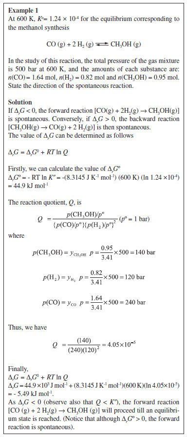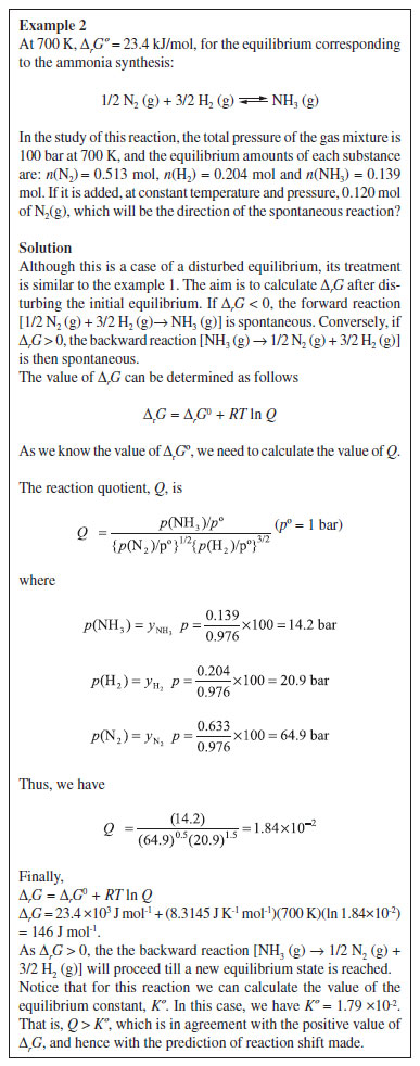 CONCLUSIONS The presentation of Gibbs energy accomplished in this paper assists in establishing the fundamentals to make alternative accurate approaches to the current misrepresentations found in general chemistry textbooks.12,13 This paper has focused on the appropriate calculation of both ΔrG and ΔrGº and on the meaning of their sign. To accomplish this purpose, the examples examined in this study were designed on the proper use of free energy of reaction in the analysis of spontaneous reactions. It is stressed that the calculation (and then the sign) of ΔrG serves to establish the direction of a chemical reaction. Clarification in the meaning of the different terms involved seems essential, which provides sound approaches when dealing with spontaneous reactions. Two problematic cases have been analysed on the basis of current misrepresentations and misconceptions. It has been emphasized that: a) the sign of ΔrGº must not be used as a general condition in order to predict the direction of a spontaneous reaction and b) adding a reactant to a chemical equilibrium mixture at contant pressure is a case in which the Le Châtelier's principle is a limited rule that can be overcome analysing the meaning of Q-K inequalities (which are grounded on the meaning of the sign of ΔrG) in order to make accurate predictions. Hence, similar problems to the ones discussed in this study can be presented to students when dealing with spontaneous reactions. This may help instructors in avoiding both current misrepresentations of Gibbs energy and the misuse of Le Châtelier's principle.