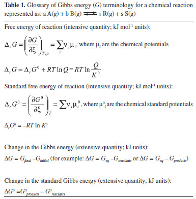 IES Benicalap, Departamento de Física y Química, Nicasio Benlloch, 46015 Valencia, Spain Recebido em 16/05/2014 *e-mail: juan.quilez@uv.es This paper summarizes the misrepresentations related to Gibbs energy in general chemistry textbooks. These misrepresentations arise from a problem in the terminology textbooks use. Thus, after reviewing the proper definition of each of the terms analyzed, we present two problems to exemplify the correct treatment of the quantities involved, which may help in the discussion and clarification of the misleading conventions and assumptions reported in this study. INTRODUCTION Research on learning difficulties associated with thermodynamics is well documented.1 Educational studies2,3 suggest that one of the sources of the students' learning difficulties in physical chemistry lies in how textbooks and teachers deal with key chemistry concepts. For example, several authors4-11 have made an inventory of university students' misconceptions due to a poor understanding of the spontaneity concept. Some of those misunderstandings may have their origin in the way this concept is taught. Misrepresentation of Gibbs energy Misrepresentations in Gibbs energy (G) terminology can be found in many general chemistry textbooks. A complete discussion on this issue has been reported recently.12,13 It was found that there are Gibbs energy changes that refer to different processes and that frequently they are not properly defined. For example, some authors discuss the sign of ΔGº in order to stablish the spontaneous direction of a reaction mixture. Hence, these presentations often lead to the assumption that ΔGº < 0 corresponds to a general condition for spontaneity; conversely, it is assumed that if ΔGº > 0 the forward reaction is forbidden. Those two referred studies concluded that most of the textbook confusions arise due to the overuse of the symbol 'Δ' in teaching thermodynamics in introductory university chemistry courses. That is, it is usually assumed that ΔGº plays the role of ΔrGº; similarly, ΔrG is normally misrepresented as ΔG. For example, Q-K inequalities are normally employed to decide the direction of a disturbed equilibrium system, but this discussion is usually based on the following equation ![]() (instead of ΔrG = RT In Spontaneity and equilibrium In order to avoid the teaching of misrepresentations similar to the ones stated above, in this section the aim is to consider practical situations exemplifying accurate calculations for the discussion of spontaneous reactions. Therefore, we will focus on discussing the meaning of spontaneity, stressing that this concept refers both to determining whether a reaction is product- or reactant-favored and to predicting the direction in which a reacting system shifts in response to a disturbance. Examples 1 and 2 are presented for this purpose. These problems focus on both the meaning of the sign of ΔrG and its units. Eventually, Table 1 provides a glossary of Gibbs energy terminology in order to summarize the discussion that follows.