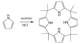 EXPERIMENTAL Part A - Synthesis Melting points were obtained on a Kofler hot stage and were uncorrected. The NMR spectra were recorded on a Varian AS-400 spectrometer. Chemical shifts were recorded in ppm with the solvent resonance as the internal standard. Data are reported as follows: chemical shift, multiplicity (s = singlet, d = doublet, dd = doublet of doublets, t = triplet, m = multiplet), coupling constants (Hz) and integration. FTIR spectra were obtained with an ABB FTLA 2000 spectrophotometer, with KBr pellets. A detailed description of the synthesis and characterization of the compounds is given below and the results (amounts of reactants, yields, and spectrometric data) obtained by one of the student groups are used to illustrate the experimental procedures. Compound 1 Pyrrole (2.5 mL) and acetone (12.5 mL) were placed in a 50 mL round-bottomed flask coupled to an addition funnel, under magnetic stirring and in an ice bath. The solution was cooled for 20 min and concentrated HCl (1.2 mL) was then added to the addition funnel. HCl was added dropwise to the acetone solution and after each drop a change in color and effervescence in the reaction mixture were observed, followed by rapid precipitation of 1 as a white solid. After the addition of HCl, stirring was continued for 1 h. The solid was then filtered, washed with cold acetone (16.0 mL) and dried in oven at 40 ºC for 1 h to yield 1.2 g of a white solid (31% yield) with a melting point of 294-296 ºC (lit.18 296 ºC). IR (KBr, nmax/cm-1): 3443 (N-H aromatic), 2972, 2931, 2870 (C-H); 1577, 1506, 1448, 1414 (C-C and C-N). 1H NMR (400 MHz, CDCl3): δ/ppm 7.06 (4H, s, NH1) 5.91 (8H, s, H2), 1.53 (24H, s, H3). 13C NMR (100 MHz, CDCl3): δ/ppm 138.4, 102.8, 35.1, 29.1. Compound 419 10 mL of an aqueous solution of NaOH (11%) and absolute ethanol (5 mL) were mixed in a 50 mL Erlenmeyer flask equipped with a magnetic stirrer. The flask was placed in an ice bath and freshly distilled acetophenone (2.62 g, 21 mmol) was then added. The mixture was stirred and pure benzaldehyde (2.07 g, 0.019 mol) was added. The temperature of the mixture was maintained at 25 ºC while stirring vigorously until the mixture became thick (2-3 h). Stirring was discontinued and the reaction mixture was left in a refrigerator overnight. The precipitate was filtered through a Büchner funnel, washed with cold water until the washings showed neutral pH and then the solid was washed with cold ethanol (10 mL). The product was recrystallized from ethanol at 50 ºC, to give 2.61 g (64% yield) of a solid with a melting point of 55-57 ºC (lit.19 56-57 ºC). IR (KBr, nmax/cm-1): 1664 (C=O), 1607 (C=C), 1336, 1207 (C-C(=O)-C). 1H NMR (400 MHz, DMSO-d6): δ/ppm: 8.15 (2H, d, J = 7.2 Hz, Ar-H6) 7.94 (1H, d, J = 15.6 Hz, H5), 7.89 (2H, dd, J = 7.4 and 3.1 Hz, Ar-H3), 7.75 (1H, d, J = 15.6 Hz, H4), 7.67 (1H, t, J = 7.4 Hz, Ar-H8), 7.57 (2H, t, J = 7.4 Hz, Ar-H7), 7.47-7.44 (3H, m, Ar-H1,2). 13C NMR (100 MHz, DMSO-d6): δ/ppm: 188.9, 143.8, 137.3, 134.4, 132.9, 130.4, 128.7, 128.6, 124.0, 128.3. Compound 5 Chalcone 4 (2.03 g; 97 mmol) was placed in a 25 mL Erlenmeyer flask, on a heating plate and under magnetic stirring, and the compound was heated until complete melting (70 ºC). Subsequently, 0.4 mL of 70% HClO4 was added dropwise cautiously (WARNING: perchlorates are explosives! The students and the instructor need to be careful in the manipulation of perchlorates)20 and previously distilled acetophenone was then added (0.5 g; 40 mmol). This mixture was kept at 70 ºC for 2-3 h. After this time the solution became thick and 5.0 mL of ethyl ether were added. The precipitate obtained was filtered, washed with cold ethyl ether (5.0 mL) and the solid was recrystallized twice from methanol to give 0.63 g (37.5%) of a yellow solid with a melting point of 288-290 ºC (lit.21 290 ºC). IR (KBr, nmax/cm-1): 1623, 1593 (C=C), 1248 (C-O-C), 772 (ClO4-). 1H NMR (400 MHz, DMSO-d6): δ/ppm 9.16 (2H, s, Ar-H4) 8.59 (6H, d, J = 7.4 Hz, Ar-H3,4,5), 7.87 (3H, t, J = 7.4 Hz, Ar-H1,2), 7.79 (6H, t, J = 7.4 Hz, Ar-H6,7). 13C NMR (100 MHz, DMSO-d6): δ/ppm 170.1, 135.0, 129.94, 129.9, 129.9, 129.1, 128.8, 115.2. Compound 3 4-Aminophenol (0.08 g; 0.73 mmol) and the pyrylium salt 5 (0.3 g; 0.73 mmol) were dissolved in absolute ethanol (8.0 mL) with magnetic stirring in a 10 mL three-neck round-bottom flask attached to a flux condenser and coupled to a birthday balloon filled with argon. The system was immersed in an oil bath, which was placed on a heating plate. The reaction mixture was heated under stirring for 1 h at 70 ºC. Subsequently, a drop of glacial acetic acid was added and the heating and stirring was continued for a further 3 h. After cooling to reach room temperature, the mixture was placed in a refrigerator overnight and the precipitate was filtered off, washed with cold ethanol and recrystallized in ethanol, yielding 0.23 g (78% yield) as a white solid with a melting point of 246-248 ºC (lit.22 250 ºC). IR (KBr, nmax/cm-1): 3062 (C-H), 1622, 1513 (C=C, C=N). 1H NMR (400 MHz, DMSO-d6): δ/ppm 9.85 (1H, s, Ar-OH) 8.62 (2H, s, Ar-H4), 8.33 (2H, d, J = 7.0 Hz, Ar-H3), 7.69-7.62 (3H, m, Ar-H1,2), 7.44-7.18 (10H, m, Ar-H5,6,7), 7.19 (2H, d, J = 8.8 Hz, Ar-H8), 6.48 (2H, d, J = 8.8 Hz, Ar-H9). 13C NMR (100 MHz, DMSO-d6): δ/ppm: 157.8, 156.7, 155.2, 133.4, 133.3, 130.4, 129.8, 129.6, 128.7, 128.0, 125.0, 114.8. In order to obtain the deprotonated form of 3, 0.20 g of the compound was stirred at room temperature with 2.0 mL of an aqueous solution of NaOH 5% in a 5.0 mL beaker. The formation of a red solid occurred, which was filtered off, washed with iced water, and finally dried in desiccators with silica, which causes the color to change from red to deep violet. This solid has a melting point of 222-224 ºC. Part B - Anion detection All UV-vis experiments were performed on Varian Cary Bio 50 and HP 8452A spectrophotometers equipped with a thermostated bath, and all measurements wer