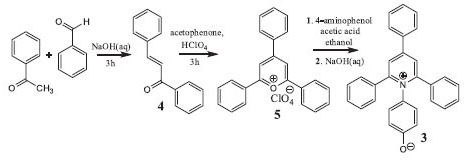 Scheme 2 summarizes the synthesis of compound 3, which is adapted from descriptions in the literature for the synthesis of compound 2.17,21,22,24 The condensation of acetophenone with benzaldehyde in basic media provided the chalcone 4 (57 to 68% yields were obtained for the four groups of students involved in the preparations). It is important to note that two doublets at 7.77 and 7.96 ppm related to the hydrogens of the CH=CH double bond were observed in the 1H NMR analysis, which are associated with the coupling constant of 15.6 Hz, typical of the trans spatial arrangement, and on the 13C NMR spectrum a signal at 188.9 ppm, related to the ketone carbonyl group, was present. The pyrylium salt 5 was obtained by reacting compound 4 with acetophenone in the presence of perchloric acid, in yields varying from 37 to 65%. The amount of perchloric acid used in this experiment was very small, and no risks associated with its utilization were observed. However, this step can be replaced by other procedure, described by Osterby and McKelvey,17 which uses sulfuric acid instead of perchloric acid. The 1H NMR spectrum of the pyrylium salt shows a singlet at 9.16 ppm, attributed to the hydrogens of the pyrylium ring. Curiously, the ortho hydrogens of the three rings bound to the pyrylium ring appear as a doublet at the same position (8.59 ppm). The 13C NMR spectrum shows a signal at 170.1 ppm related to the C2 and C6 atoms of the pyrylium ring, the deshielding effect being due to the influence of the neighboring oxygen. Finally, the reflux of compound 5 with 4-aminophenol for 3 h, followed by deprotonation using sodium hydroxide, yielded pyridinium N-phenolate 3 in 73-89% yield. The 1H NMR spectrum shows a signal at 9.85 ppm related to the -OH phenolic group, a signal at 8.62 ppm related to the hydrogens of the pyridinium ring and two doublets at 6.48 and 7.19 ppm, related to the hydrogens of the phenolic moiety of the compound. The 13C NMR spectrum shows three deshielded signals at 155.2, 156.7 and 157.8 ppm, which are related to the carbon atoms of the pyridinium center. One of the students was responsible for the preparation of compound 2, which was obtained from the reaction of compound 5 and 4-amino-2,6-diphenylphenol, according to a method described in the literature.17 However, the preparation of compound 2 is optional, being used only for comparison with compound 3.