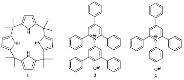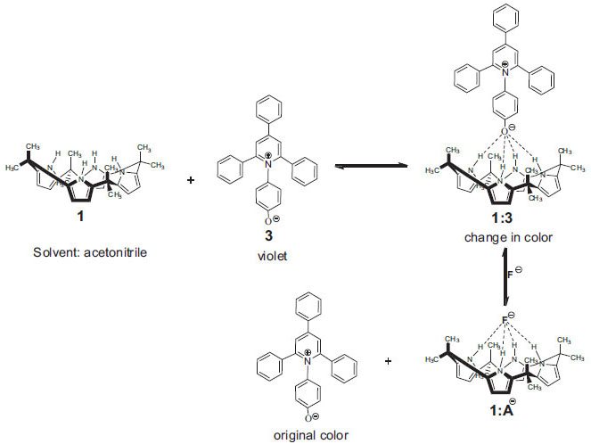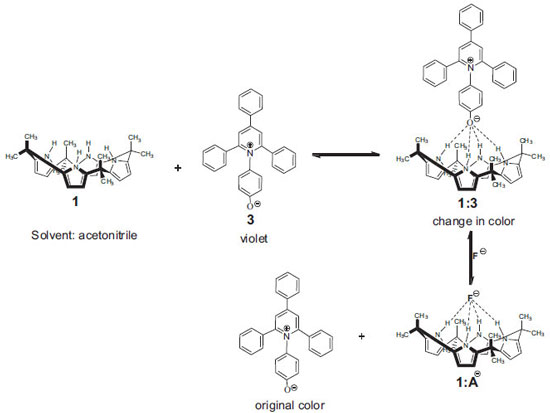 Scheme 3 summarizes the experiment performed by the students. Compound 3 is violet in solution, but the solution turns yellow with the addition of 1 due to the formation of the 1:3 complex. Since fluoride is an anion able to interact strongly with 1, the pyridinium N-phenolate is displaced from the receptor site of 1 and the free betaine dye is again responsible for the original violet color.