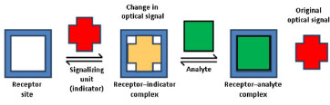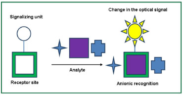 Many strategies have been applied to the development of chromogenic chemosensors. One of the most commonly used involves the concept of displacement assays (Figure 2), which is based on the idea of competition between the analyte and a dye for the receptor site.6 The complexation of the dye with the receptor through intermolecular interactions causes a change in the color of the solution. With the addition of the analyte, if the interaction of the analyte with the receptor is stronger than that of the dye, a dislodgement of the dye occurs and a change in the color of the solution is observed.