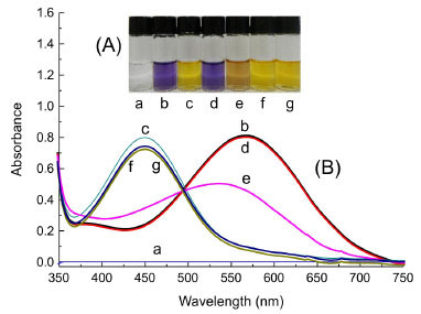 ![]() Figure 4. (A) Solutions in acetonitrile and (B) UV-vis spectra of (a) 1, (b) 3, (c) 1:3 complex, and 1:3 complex in the presence of (d) F-, (e) Cl-, (f) Br-, and (g) I-(c (anion) = 5.0×10-4 mol L-1). The concentrations of 1 were 5.0×10-4mol L-1 and 3 were 3.5×10-4 mol L-1