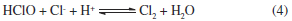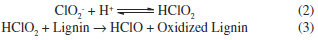 In general chlorous acid tends to be reactive, except when it reacts with phenolic lignin, in this case it is produced hypochlorous acid as a product of reduction reaction.25 It is also observed an equilibrium among hypochlorous acid and chloride ion versus chlorine, which is dependent on the pH (Equation 4). Chlorate ion tends to be suppressed due to formation of chloride ions.