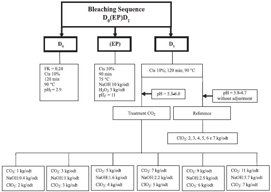 MATERIALS AND METHODS Materials A kraft eucalyptus pulp supplied by a Brazilian Pulp Company was used. This sample was collected after oxygen delignification stage (O2 Stage). The characteristics in the beginning of the experimentation were: brightness equal to 51.8 %ISO; kappa number (residual lignin) equal to11.4; and viscosity equal to 1003 dm3/kg. Methods In order to investigate the effect of using a buffering compound in the final chlorine dioxide bleaching stage, an elemental chlorine free sequence (ECF) D0(EP)D1 was performed. The D0 and EP stages were operated under the same conditions for the reference pulp bleaching sequence, and for the pulp bleaching sequence with CO2 addition. The first chlorine dioxide stages (D0) were carried out at 10% consistency, end pH 2.9, 90 ºC, 120 minutes, and a kappa factor of 0.2. The EP stages were run at 10% consistency, end pH 11, 75 ºC, 90 minutes, and hydrogen peroxide doses of 0.3% by pulp weights. The final dioxide chlorine stages (D1) were carried out at 10% consistency, 90 ºC, and 120 minutes. For the reference treatment (without CO2 addition and no pH adjustment) variable dosages of chlorine dioxide to achieve the desired brightness were used. The treatment with CO2 addition as a buffering compound was carried out at end pH 5.5 being used NaOH for controlling the pH, and as well as for the reference variable dosages of chlorine dioxide to achieve the desired brightness were used. In this stage were applied variable dosages of carbon dioxide by bubbling the CO2 into the pulp during a previously computed time. The feasibility of using this technology was evaluated by comparing different bleaching conditions, which were conventional bleaching using standard conditions versus optimized application of carbon dioxide (CO2). The pH desired was achieved by using sodium hydroxide (NaOH). The conditions were established through experiences in the Pulp and Paper Laboratory-UFV. Figure 1 shows a flowchart of the experimental design.