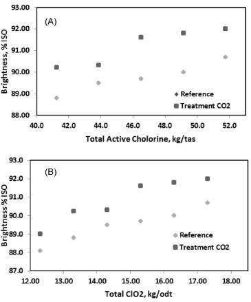 ![]() Figure 2. (A) Amount of total active chlorine, kg/odt necessary to achieve a given brightness, the D1 stage being conducted at pH 4.0 (reference), and 5.5 (buffered with CO2); (B) Amount of chlorine dioxide required to reach a brightness of 90% ISO kg /odt; D1 stage being conducted at pH 4.0 (reference), and 5.5 (buffered with CO2)