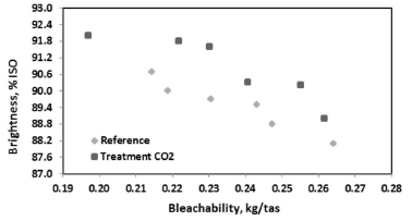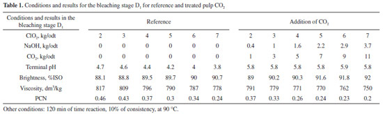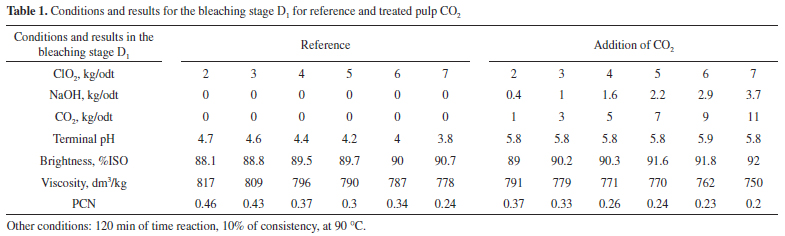 RESULTS AND DISCUSSION Analyzing the performance of the bleaching sequence D0(EP)D1 for the brightness of 90% ISO for the reference samples and with the addition of CO2, it was possible to observe a positive effect of using a buffer agent in the last bleaching stage. The bleaching results are being discussed considering the CO2 charge applied and its buffering effect, consumption of reagents, bleachability and pulp quality. These results are shown in Table 1 and in Figures 2 to 5.