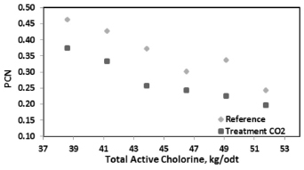 ![]() Figure 4. Brightness stability as measured by post color number (PCN), the pulps bleached by the conventional method (reference), and chlorine dioxide at near neutral pH (buffered with CO2)