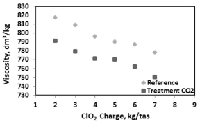 Many studies have shown that decreasing pH, an increasing in the chlorate ion is observed; this phenomenon is responsible for decreasing the chlorine dioxide oxidative power. On the other hand, increasing pH, there is also a higher formation of chlorite ions, which are responsible for regenerating the chlorine dioxide.20,24,26 Another benefit due to buffering in stage D1 was the improvement of the bleachability of the pulp (Figure 3). It can be seen that the change of pH control technology by employing CO2 improved the bleachability of the pulp by the sequence D0(EP)D1. Bleachability is defined as the number of units of the kappa number removed in bleaching for each kg of active chlorine used in the bleaching process, including all stages. The bleached pulp quality was evaluated by the brightness stability and viscosity. The brightness stability was measured by the brightness reversion expressed by the post color number (PCN). High PCN indicates low brightness stability, which can be explained due to leucochromophore groups present in the pulp.2 Under adverse conditions of moisture and temperature, these groups can be transformed into chromophore groups, returning to its initial structure, causing the pulp yellowing. The Figure 4 exhibits the bleached pulp pH buffered with CO2 in the D1 stage, regardless of the dosage, showed a lower PCN than the pulp reference. Therefore, even with a lower ClO2 dosage required to achieve 90% ISO brightness, pH buffering resulted in the decreasing of the oxidized groups, responsible for the brightness reversion. Bleaching with chlorine dioxide buffered with CO2 showed slightly negative effect on the viscosity of the bleached pulp compared to conventional bleaching (Figure 5). This fact can be explained due to the intense generation of the hypochlorite acid (HClO) in this pH range, which is the responsible for damaging cellulose chains.12,27 However, it is important to notice that the process of neutralized bleaching with ClO2 (addition of CO2) requires lower dosages of this reagent to achieve desired brightness in relation to the reference process, and hence to the same level of brightness. The pulp viscosities obtained with the new process (779 dm3/kg), and the reference process (787 dm3/kg) were close.