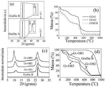 ![]() Figura 2. (a) Difratogramas de raios X do Grafite A e do Grafite B; (b) Curvas termogravimétricas das amostras GOA1, GOA2 e GOB1B; (c) Difratogramas de raios X normalizados em funçao da intensidade do pico (002) do grafite e (d) curvas termogravimétricas do grafite e das amostras Gr-OB1, Gr-OB2 e Gr-OB3