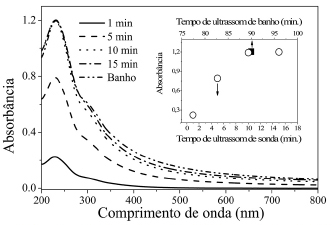 ![]() Figura 3. Espectros UV-Vis das dispersões obtidas a partir da esfoliação da amostra Gr-OB1 utilizando 1, 5, 10 e 15 min. de ultrassom de sonda e 90 min. de banho de ultrassom. (detalhe) Absorbância da banda em 230 nm das dispersões em função do tempo e tipo de ultrassom