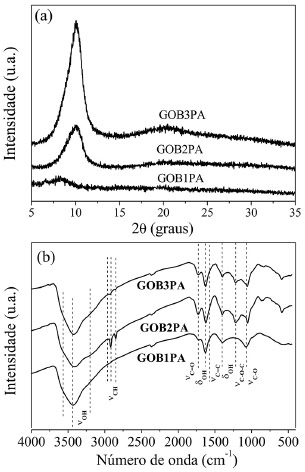 ![]() Figura 4. (a) Difratogramas de raios X das amostras GOB1PA, GOB2PA e GOB3PA; (b) espectros de infravermelho das amostras de GOB1PA, GOB2PA e GOB3PA