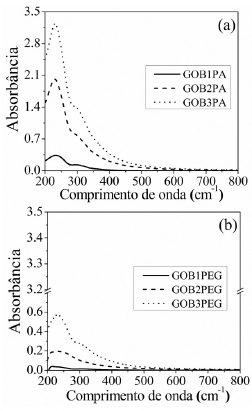 ![]() Figura 5. Espectros de UV-Vis das dispersões preparadas em (a) H2O e (b) EG