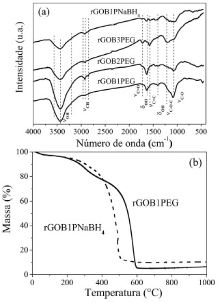 ![]() Figura 6. (a) Espectros no infravermelho das amostras de rGOB1PEG, rGOB2PEG, rGOB3PEG e rGOB1NaBH4 e (b) Curvas termogravimétricas das amostras rGOB1PEG e rGOB1NaBH4