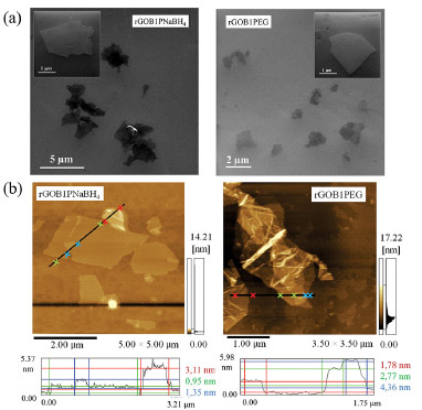 ![]() Figura 7. Imagens de (a) microscopia eletrônica de varredura e (b) de força atômica das amostras rGOB1PEG e rGOB1NaBH4