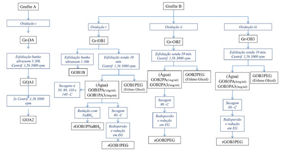 EXPERIMENTAL Materiais Duas amostras diferentes de grafite (Nacional de Grafite), ácido sulfúrico (Carlo Erba), nitrato de sódio (Vetec), permanganato de potássio (Merck), peróxido de hidrogênio (Vetec), etileno glicol (Carlo Erba), borohidreto de sódio (Merck), hidróxido de sódio (Vetec) e argônio (White Martins) foram utilizados como recebidos. Em todo processo foi utilizada água deionizada por um sistema Milli-Q®. Oxidação do grafite A oxidação do grafite foi realizada por três diferentes abordagens, baseadas em modificações no método de esfoliação do grafite bulk, conforme descrito a seguir: i) em um balão de 500 mL, previamente colocado em banho de gelo, foram misturados 46 mL de H2SO4 (98%), 2 g de grafite, e 1 g de NaNO3. Após 15 min. de vigorosa agitação, a qual foi mantida durante todo o processo, 6 g de KMnO4 foram lentamente inseridos na mistura. Após 75 min., 92 mL de água deionizada foram cuidadosamente adicionados, seguidos de mais 280 mL de água quente (~ 100 ºC). Finalmente, visando consumir o excesso de agente oxidante, foram adicionados 10 mL de solução aquosa de H2O2 (30% v v-1). Este mesmo procedimento foi aplicado a duas amostras de grafite, com diferentes graus de pureza, fornecidos pela empresa Nacional de Grafite SA: Graflake 9550 (90%), denominado grafite A e Graflake 99580 (99%), denominado grafite B, gerando respectivamente os óxidos de grafite Gr-OA e Gr-OB1; ii) nesta rota utilizou-se somente o grafite B, e foram mantidas as principais condiçoes descritas em i), porém a oxidaçao se deu na ausência de banho de gelo após a adiçao de KMnO4, conduzindo a um aumento de temperatura para aproximadamente 80 ºC. O óxido originado foi então denominado Gr-OB2; iii) utilizando somente a amostra de grafite B, nas mesmas condições descritas em ii) porém aumentando de 75 para 180 min. o tempo de oxidação do grafite. O óxido gerado neste procedimento será referenciado como Gr-OB3. Os sólidos obtidos após as três sínteses foram lavados com 500 mL de uma solução aquosa de ácido clorídrico (10% v v-1) para a remoção de íons de sulfato e, em seguida, lavados com água deionizada sucessivas vezes, até pH neutro. Todo material foi seco em estufa a uma temperatura de 60 ºC durante 24 h. Esfoliação de óxido de grafite para óxido de grafeno Para as dispersões contendo Gr-OA e Gr-OB1, foi usado como agente esfoliante um banho de ultrassom (Unique USC 1880, 37 kHz - 154 W). Uma quantidade definida de amostra (aproximadamente 100 mg) foi colocada em 100 mL de água, e deixada sob banho de ultrassom por 90 min. As dispersões obtidas aqui foram denominadas, respectivamente, GOA1 e GOB1B. Para a dispersão dos óxidos GrOB1, GrOB2 e GrOB3 foi utilizado um ultrassom de sonda (Cole Parmer CP505 - 20 kHz - 500 W) com tempos variando de 1, 5, 10 e 15 min. As dispersões utilizando água como solvente, na concentração de 1 mg de Gr-O por mL H2O, foram denominadas GOB1PA, GOB2PA e GOB3PA. Foram também preparadas dispersões em água dos óxidos de grafite, obtidas a partir de concentrações de 3 mg de Gr-O por mL H2O, aqui denominadas GOB1PA3, GOB2PA3 e GOB3PA3. Foram também preparadas dispersões utilizando o etileno glicol (EG) como solvente, na concentração de 3 mg de Gr-O por mL de EG, que por sua vez foram denominadas GOB1PEG, GOB2PEG e GOB3PEG. Todas as dispersões obtidas foram centrifugadas (3000 rpm) durante 90 min. e o precipitado decorrente do processo de centrifugação foi descartado. A amostra GOA1 foi ainda submetida a uma segunda centrifugação a 3000 rpm durante outros 90 min., resultando na amostra GOA2. Estudo da redispersão Para o estudo da redispersão do óxido de grafeno, 500 mL de uma dispersão do GOB1PA (0,1 mg mL-1 H2O) foi concentrada, em placa de aquecimento, até atingir dez vezes sua concentração inicial. Essa dispersão concentrada foi dividida em quatro partes, e cada uma delas foi submetida às temperaturas de 50, 80, 110 e 140 ºC, até completa evaporação do solvente. A seguir, uma massa de 0,6 mg de cada um dos sólidos obtidos foi redisperso em 4 mL de água. A estabilidade dessas redispersões foi avaliada por espectroscopia no UV-Vis no momento do preparo e após 24 h. Redução do GO para rGO A dispersão GOB1PA foi reduzida utilizando o NaBH4, que foi adicionado sólido à dispersão, numa proporção de 4 mg de NaBH4 para cada mililitro de dispersão, em refluxo durante 3 h. O sólido resultante foi separado por filtração, lavado diversas vezes com água deionizada, secos a 50 ºC por 24 h, e denominado rGOB1PANaBH4. Esta mesma amostra (GOB1PA), assim como as amostras GOB2PA e GOB3PA, após secas à 80 ºC e redispersas em EG na concentração de 0,25 mg mL-1, foram também reduzidas usando um método solvotermal, tendo o etileno glicol atuando tanto como solvente quanto como agente redutor, sob agitação e em refluxo a 195 ºC durante 2 h. As amostras de rGO obtidas foram denominadas, respectivamente, rGOB1PEG, rGOB2PEG e rGOB3PEG. Sumarizando, as siglas utilizadas para referenciar as amostras nesse trabalho são Gr-O para os óxidos de grafite, GO para os óxidos de grafeno e rGO para o óxido de grafeno reduzidos (grafeno). A segunda letra nos acrônimos refere-se ao grafite de origem "A", para o grafite A e "B" para o grafite B. A partir das amostras de GO usa-se uma terceira letra associada ao tipo de ultrassom utilizado para preparar a dispersão: "B" para ultrassom de banho e "P" (de probe) para o ultrassom de sonda. E por fim as últimas letras estão associadas ao solvente no qual o GO foi esfoliado: "A" de água e "EG" de etileno glicol. O fluxograma esquematizando todas as etapas descritas está ilustrado na Figura 1.