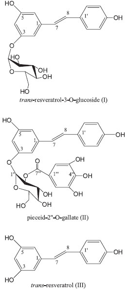 Structural identification The chemical structure of each peak fraction separated by HSCCC was identified according to its 1H-NMR and 13C-NMR data. In comparison with reference data, peak I, peak II, and peak III were effectively identified as trans-resveratrol-3-O-glucoside, pieceid-2"-O-gallate and trans-resveratrol, respectively. The results for each peak fraction were as follows. Peak I, white powder (methanol): 1H NMR (CD3OD, 400 MHz): δ = 7.35 (2H, d, J = 8.5 Hz, H-2', H-6'), 7.00 (lH, d, J = 16.3 Hz, H-8), 6.84 (lH, d, H-7), 6.78 (1H, s, H-2), 6.76 (2H, d, H-3', H-5'), 6.61 (1H, s, H-6), 6.44 (1H, s, H-4), 4.88 (1H, d, J = 7.1Hz, Glc H-1"), 3.92 (1H, dd, J = 1.5 Hz, J = 12 Hz, Glc H-6a"), 3.70 (1H, dd, J = 5.8 Hz, Glc H-6b"), 3.48-3.38 (4H, m, Glc H-2", H-3", H-4", H-5"). 13C NMR (400 MHz, CD3OD): δ = 141.4 (C-1), 107.0 (C-2), 160.5 (C-3), 104.1 (C-4), 159.6 (C-5), 108.4 (C-6), 126.7 (C-7), 130.0 (C-8), 130.3 (C-1'), 128.9 (C-2'), 116.5 (C-3'), 158.5 (C-4'), 116.5 (C-5'),128.9 (C-6'), 102.4 (Glc-1), 75.0 (Glc-2), 78.1 (Glc-3), 71.5 (Glc-4),78.3 (Glc-5) and 62.6 (Glc-6). The 1H NMR and 13C NMR data are in agreement with the literature data for trans-resveratrol-3-O-glucoside.27 Peak II, white powder (methanol): 1H NMR (CD3OD, 400 MHz): δ = 7.39 (2H, d, J =8.5 Hz, H-2', H-6'), 7.16 (2H, d, J = 8.5 Hz, H-2''', H-6'''),7.03 (lH, d, J = 16.3 Hz, H-8), 6.85 (lH, d, H-7), 6.82 (2H, d, H-3', H-5'),6.70 (1H, s, H-2), 6.65 (1H, s, H-6), 6.38 (1H, s, H-4), 5.14 (1H, d, J = 7.9Hz, Glc H-1"), 4.02 (1H, dd, J = 11.4 Hz, Glc H-6a"), 3.70 (1H, m, Glc H-6b"), 5.14-3.45 (4H, m, Glc H-2", H-3", H-4". H-5"). 13C NMR (400 MHz, CD3OD): δ = 139.9 (C-1), 109.0 (C-2), 160.5 (C-3),104.1 (C-4), 159.6 (C-5), 107.4 (C-6), 126.7 (C-7), 130.0 (C-8),130.3 (C-1'), 128.9 (C-2'), 116.5 (C-3'), 158.5 (C-4'), 116.5 (C-5'),128.9 (C-6'), 102.4 (Glc-1), 78.4 (Glc-2), 76.1(Glc-3), 71.5 (Glc-4), 75.4 (Glc-5), 62.6 (Glc-6), 121.3 (C-1'''), 109.9 (C-2'''), 146.5 (C-3'''), 141.5 (C-4'''), 146.5 (C-5'''), 109.9 (C-6''') and 167.8(C-7'''). The 1H NMR and 13C-NMR data are in agreement with the data for pieceid-2"-O-gallate in the literature.28 Peak III, white powder (methanol): 1H NMR (CD3OD, 400 MHz): δ = 7.33 (2H, d, J = 8.5 Hz, H-2', H-6'), 6.96 (lH, d, J = 16.3 Hz, H-8), 6.81 (lH, d, H-7), 6.75 (2H, d, H-3', H-5') , 6.45 (2H, s, H-2, H-6), 6.17 (1H, s, H-4). 13C NMR (CD3OD, 400 MHz): δ = 141.3 (C-1), 105.7 (C-2), 159.6 (C-3),102.6 (C-4), 158.3 (C-5), 105.7 (C-6), 126.9 (C-7), 129.4 (C-8), 130.4 (C-1'), 128.8 (C-2'), 116.5 (C-3'), 158.5 (C-4'), 116.5 (C-5'), 128.8 (C-6'), The 1H NMR and 13C NMR data are in agreement with the data for trans-resveratrol in the literature.29