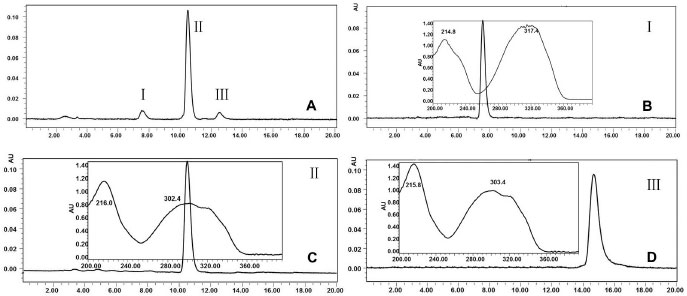 Figure 2. HPLC chromatograms of the crude extract of Polygonum cillinerve (Nakai) Ohwl (A) after cleaning macroporous resin column chromatography and the three targeted compounds (peak fractions I, II, and III, B-D, respectively) purified by HSCCC. Conditions: column, Kromasil C18 column (250 mm×4.6 mm 4 µm); column temperature, 25 ºC; mobile phase, methanol-water (35:75, v/v); flow-rate, 1.0 mL min-1, detection wavelength, 300 nm