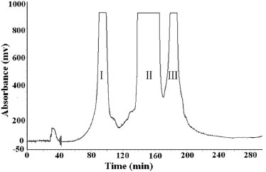 The influence of the mobile phase flow rate was also investigated. The results indicated reducing the flow rate could improve the retention of the stationary phase to a certain extent, but the chromatogram peaks were extended at the same time.25 Thus, a flow rate of 2.0 mL min-1 was employed in this study. Additionally, the revolution speed can also impact stationary phase retention; a high revolution speed is likely to cause emulsification.26 Considering of this, a speed of 800 rpm was used in our isolation procedure. HSCCC separation Under the optimized conditions, three fractions (I, II, and III) were obtained in only one round of HSCCC separation in less than 4 h. The HSCCC chromatogram is shown in Figure 3. Three fractions were obtained from 150 mg crude sample by the one-step HSCCC separation: 26.3 mg trans-resveratrol-3-O-glucoside (peak I), 42.0 mg pieceid-2"-O-gallate (peak II), and 17.9 mg trans-resveratrol (peak III). The purities of trans-resveratrol-3-O-glucoside, pieceid-2"-O-gallate, and trans-resveratrol were 99.1%, 97.8%, and 99.4%, respectively (Figure 2), as determined by HPLC.
