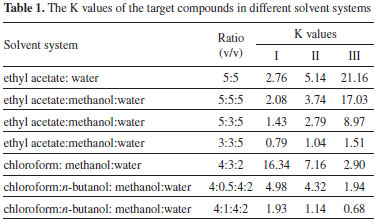 RESULTS AND DISCUSSION Optimization of the two-phase solvent system and other HSCCC conditions Successful HSCCC separation depends on the selection of a suitable two-phase solvent system, which provides an ideal partition coefficient range (0.2 < K < 2) for the target compounds.24 Large K values tend to produce excessive band broadening, while small K values usually result in a poor peak resolution. In the present study, different solvent systems including ethyl acetate-water, ethyl acetate-methanol-water, chloroform-methanol-water, and chloroform-n-butanol-methanol-water were tested according to the procedure described in the measurement of partition coefficient section. The K-values of the target compounds in different solvent systems were determined by HPLC, and the results are shown in Table 1. When two-phase solvent systems comprised of ethyl acetate-water (5:5, v/v) and ethyl acetate-methanol-water (5:5:5, 5:3:5, v/v/v) were employed, the K values were too large, resulting in broad peaks and long separation times. When the two-phase solvent system composed of ethyl acetate-methanol-water (3:3:5, v/v/v) was investigated, suitable K values of the target compounds were obtained; however, the separation factor was too small, which would result in poor separation. When two-phase solvent systems composed of chloroform-methanol-water (4:3:3, v/v/v) and chloroform-n-butanol-methanol-water (4:0.5:4:2, v/v/v/v) were used, the K values were large, which might lead to the poor retention of target compounds in the upper phase. Fortunately, an appropriate K value with good resolution could be obtained by using a two-phase solvent system of chloroform-n-butanol-methanol-water at the ratio of 4:1:4:2 (v/v/v/v). The K values of the three target compounds were between 0.5 and 2.0, and the separation factors were also large enough.