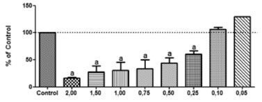 Figure 3. Na+, K+-ATPase activity in presence of different Isoschaftoside concentrations (2,00 mg - 0,05 mg mL-1). The graph shows 100% activity in control. Results are expressed as mean ± S.D. Significance was determined by ANOVA followed by Tukey's Multiple Comparison Test. Superscript letter a means significantly different from control. P <0.05 vs. control