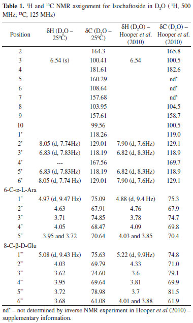 Basolateral membrane preparation Homogenized preparations of the basolateral membrane of the proximal tubule were obtained from adult pig kidneys. The kidneys were removed immediately after death of the animals and kept in an ice-cold solution containing: sucrose 250 mmol L-1, HEPESTris (pH 7,6) 10 mmol L-1, EDTA 2 mmol L-1 and PMSF 1 mmol L-1. Thin slices of the external cortex were removed and homogenized in the same solution using a Glass/Teflon homogenizer. The homogenate was centrifuged at 1.500 g at 4 ºC, for 10 min. The precipitate was removed and the homogenate was collected and subjected to sequential centrifugations for basolateral membrane isolation. Initially, the homogenate was centrifuged at 13.000 g at 4 ºC, for 44 min. After centrifugation, the supernatant was discarded and, using a solution containing sucrose 250 mmol L-1 and EDTA, pH 7.6, the most superficial layer of the precipitated was collected, which generally corresponds to the microsomal fraction. Then, using a Percoll gradient (final concentration 12% v/v), the microsomal fraction was centrifuged at 40.000 g, at 4 ºC, for 1h, to generate the Percoll density gradient, and consequently, to separate different membrane fractions contained in the brute portion of plasmatic membranes.8 The fraction corresponding to basolateral membrane was collected, homogenized using a Glass/Teflon homogenizer and centrifuged at 200.000 g, for 1h, at 4 ºC, for Percoll sedimentation. The membrane preparation was resuspended in sucrose 250 mmol L-1, and the final total protein concentration was determined by the method given by Lowry et al.9 These samples were then stored in liquid nitrogen. The Na+, K+-ATPase activity was determined by colorimetric detecting inorganic phosphate (Pi), resulting from ATP hydrolysis.10 The activity was determined by the calculating the difference between the absorbance values in the absence and presence of ouabain 2 mmol L-1 (specific Na+, K+-ATPase inhibitor). The reaction medium contained Bis-Tris-propane 50 mmol L-1 (pH 7.4), EDTA 0.2 mmol L-1, MgCl2 5 mmol L-1, NaCl 120 mmol L-1 and protein. The membranes were pre-incubated in this medium along with flavonoids at 37 ºC, for 10 min, to ensure a complete Na+, K+-ATPase modulation. The hydrolysis reaction was initiated by adding an ATP (5 mmol L-1) and KCl (24 mmol L-1) mixture, and it was terminated after 10 min by adding activated charcoal in HCl (0.1 mol L-1). Statistical analysis Graphpad Prism® 5 software was used, and the results were subjected to analysis of variance (ANOVA). This study established a significance level of P <0.05. The results are presented as the mean ± standard error of the mean. Isoschaftoside(apigenin-6-C-α-L-arabinopyranosyl-8-C-β-D-glucopyranosyde): amorphous yellow solid; 1H- and 13C- NMR Table 1; HR-ESIMS m/z 563.14048 [M-H]-(calculed for C26H27O14).