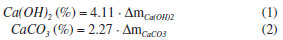 The nature of the pozzolanic reaction's products was investigated by means of thermal analyses (TG, DTG and DTA) performed in a TA Instruments SDT Q 600 thermoanalyser, in inert atmosphere (N2), with maximum flow of 100 ml/min and heating rate of 10 ºC/min, from 25 ºC to 1000 ºC. It was used a platinum crucible with sample weight of approximately 10 mg. Both RHA and SCBA pastes were analyzed at 50 days of curing. The samples were tested without previous drying and all exhibited a large step at the beginning of the TG curve due to their high water content. The unreacted Ca(OH)2 and CaCO3 formed were quantified based on the mass losses (Δm) related to the decomposition of each compound, according to Equations 1 and 2. It is important to note that the presence of CaCO3 is due to the carbonation of the Ca(OH)2 when in contact with CO2 in the air during experimental procedures.